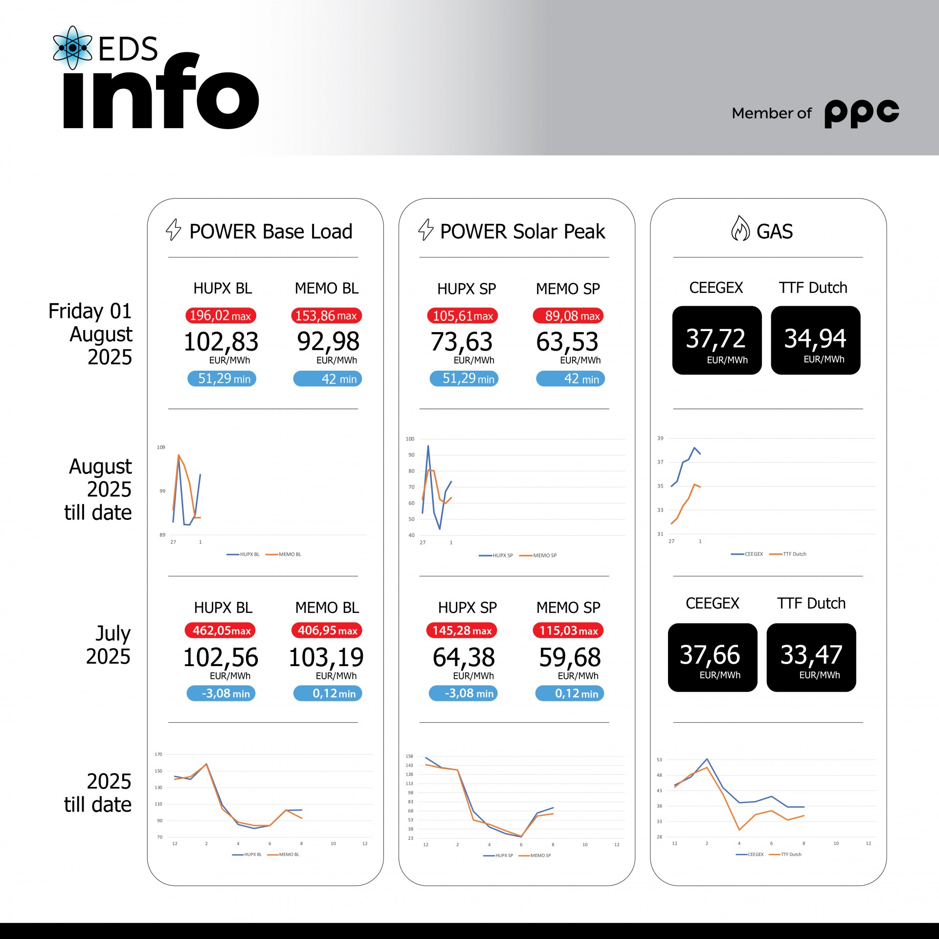 Согласно податоците за движењето на цените на берзата HUPX во Унгарија за 01 август просечната часовна цена на еден мегават час електрична енергија (baseload) изнесува 102,83 евра/mwh, додека на Македонската берза за електрична енергија цената е 92,98евра/mwh