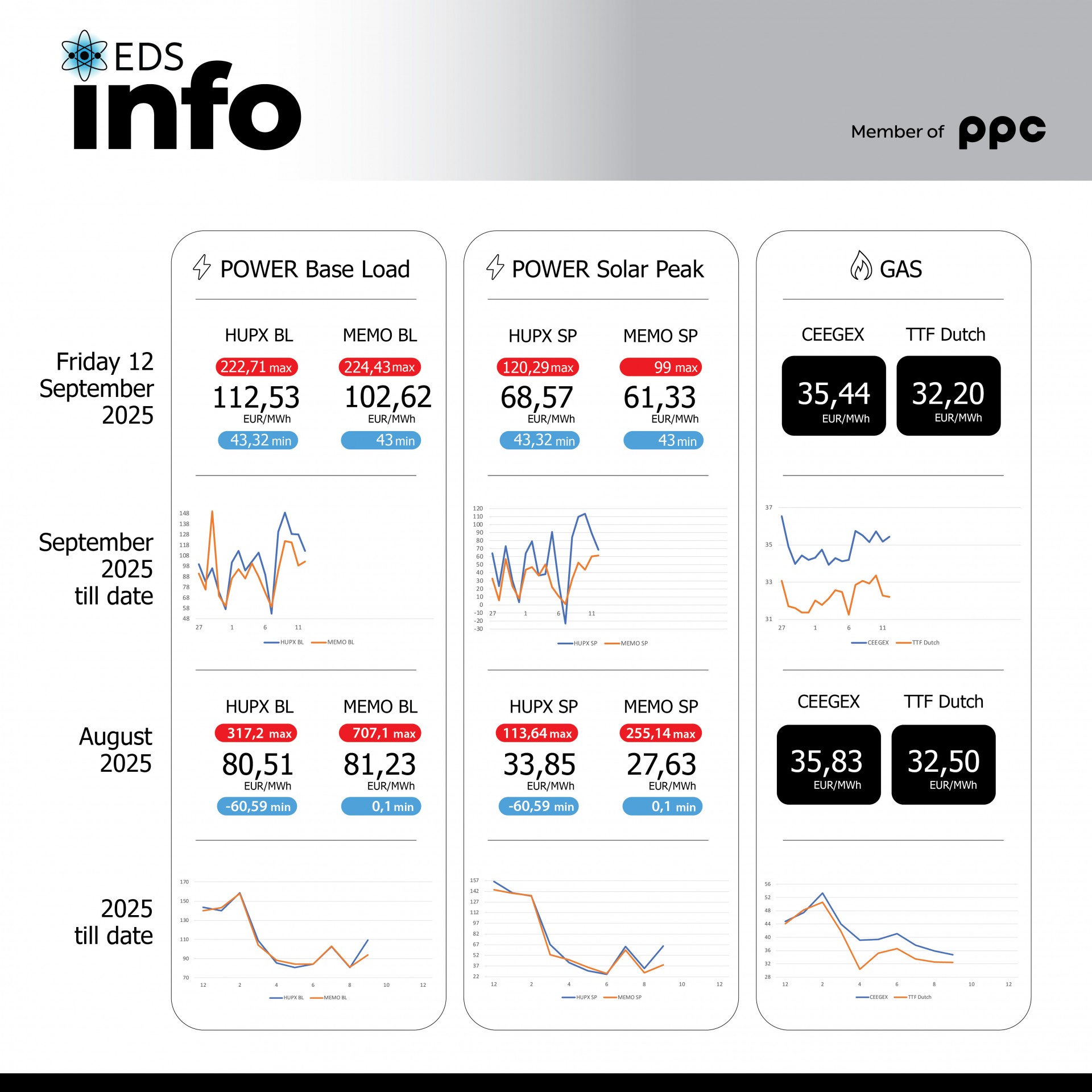ЕДС Инфо поинт: Просечната цена на струјата на HUPX берзата за петок 12.09.2025 изнесува 112,53 евра за мегават час, на МЕМО 102,62 евра за мегават час