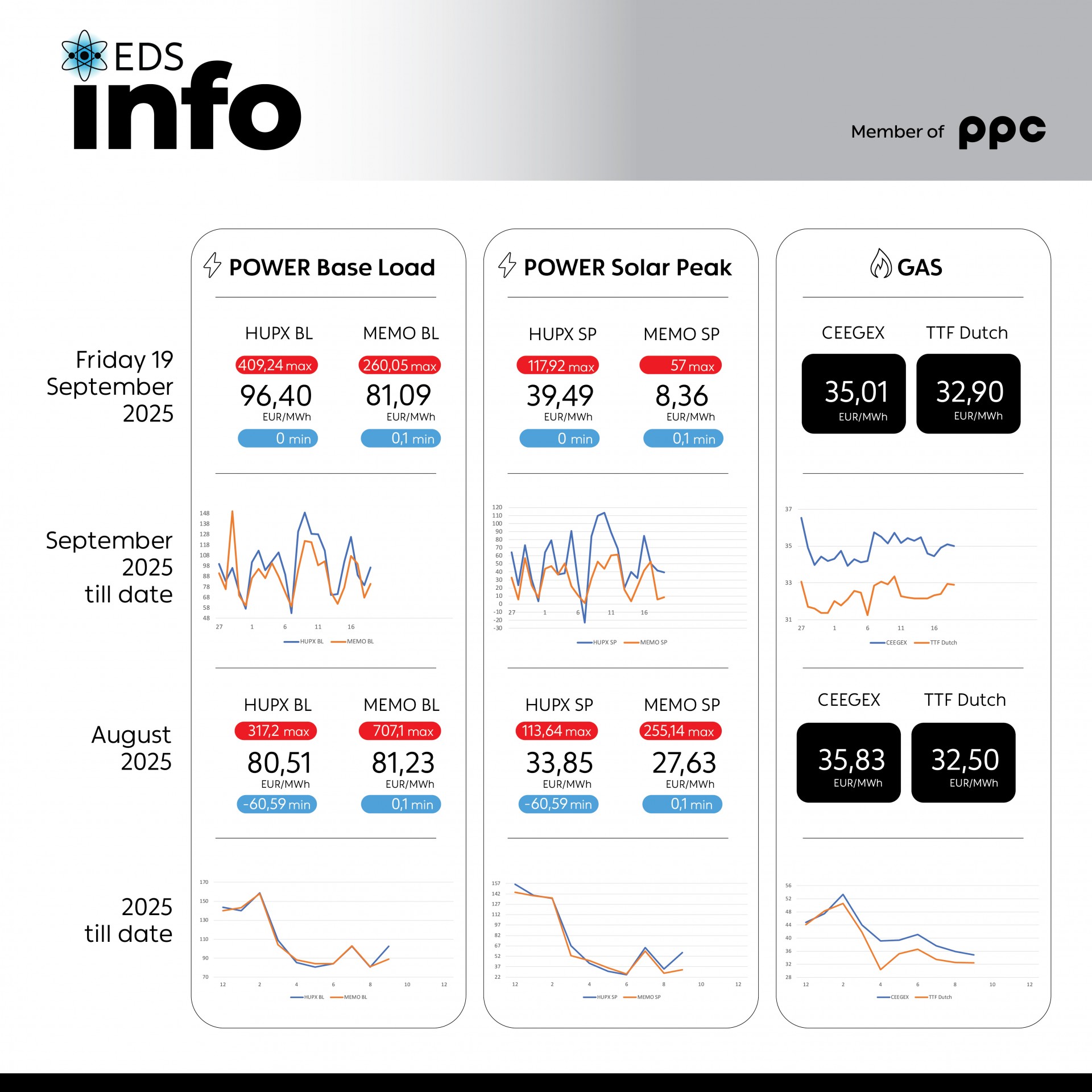 ЕДС Инфо поинт: Просечната цена на струјата на HUPX берзата за петок 19.09.2025 изнесува 96,40 евра за мегават час, на МЕМО 81,09 евра за мегават час
