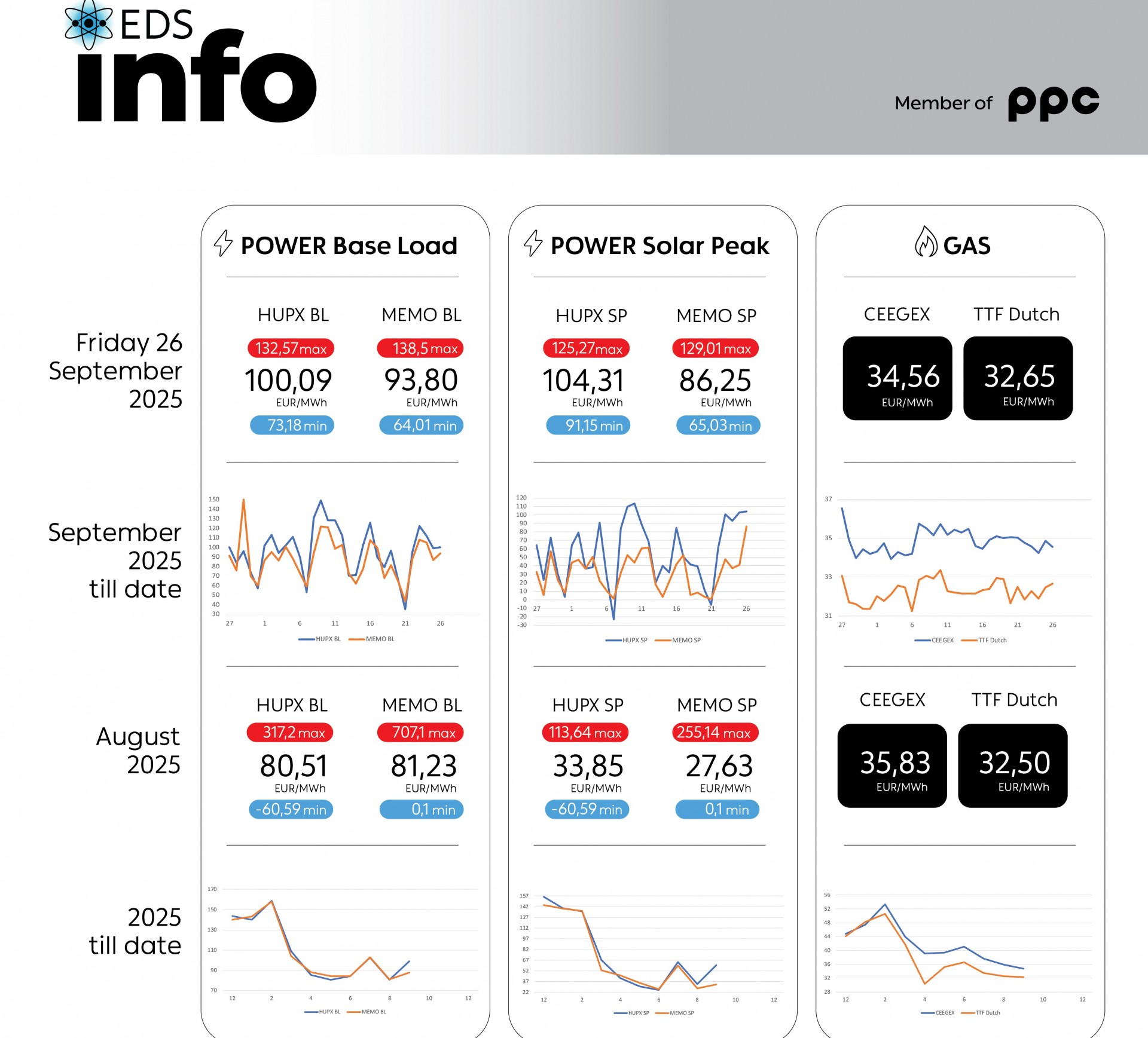 ЕДС Инфо поинт: Просечната цена на струјата на HUPX берзата за петок 26.09.2025 изнесува 100,09 евра за мегават час, на МЕМО 93,80 евра за мегават час
