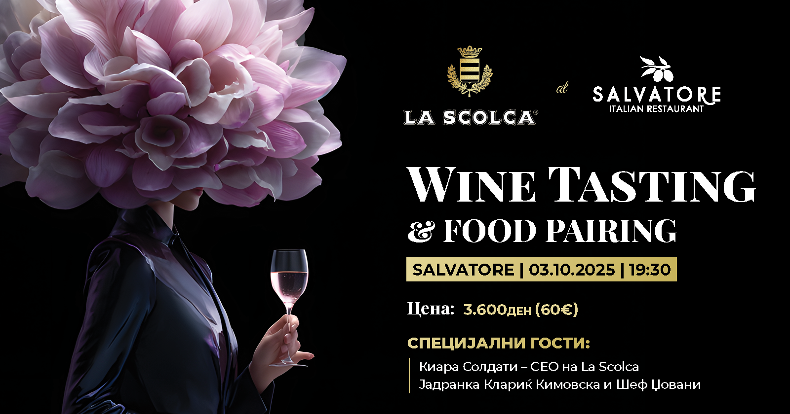Посебен белег на настанот ќе даде присуството на Јадранка Клариќ Кимовска, вински експерт која со поздравен говор ќе го отвори официјалниот дел од настанот. За гастрономското уживање ќе се погрижи шеф Џовани, главниот готвач на „Салваторе“, кој за овој настан создаде уникатно мени со италијански специјалитети кои совршено се вклопуваат со вкусот на вината „La Scolca“. За комплетно уживање во италијанската култура и традиција ќе придонесат и звуците на италијанската музика, создавајќи вистинска магија за сите сетила.