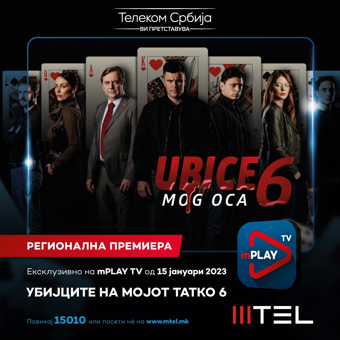 Сите нови 12 епизоди од „Убијците на мојот татко 6“ од 15 јануари ќе бидат достапни во Видеотеката на mPLAY TV. Апликацијата mPLAY TV е достапна бесплатно за корисниците преку припејд картичките mSTART, тарифниот модел mCONNECT L и пакетот mBOX Trio Max. За повеќе информации на содржините кои што се достапни на апликацијата, но и понудите за услугите на МТЕЛ може да погледнете на mtel.mk .