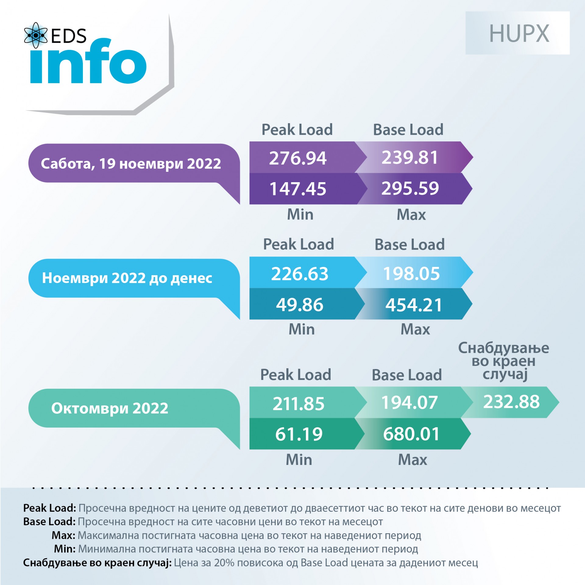 Цената на електричната енергија во текот на дневните часови (8:00 – 20:00) (peakload) постигна ниво од 276.94 евра за мегават час. Пикот на цената е во 19 часот кога изнесуваше 287,29 евра за мегават час, додека минималната цена е во 5 часот – 143,49 евра за мегават час.