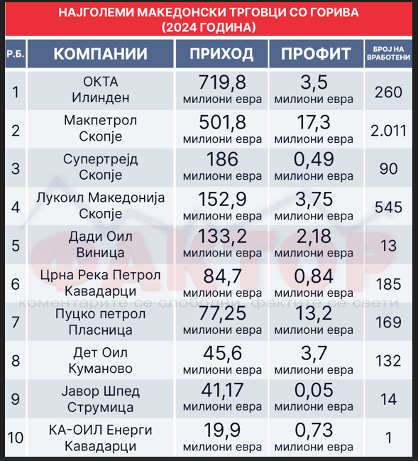 А тоа значи полни раце работа за трговците со горива, како на големо така и на мало. Агрегатниот приход на најголемите десет меѓу нив лани изнесува „округло“ две милијарди евра.