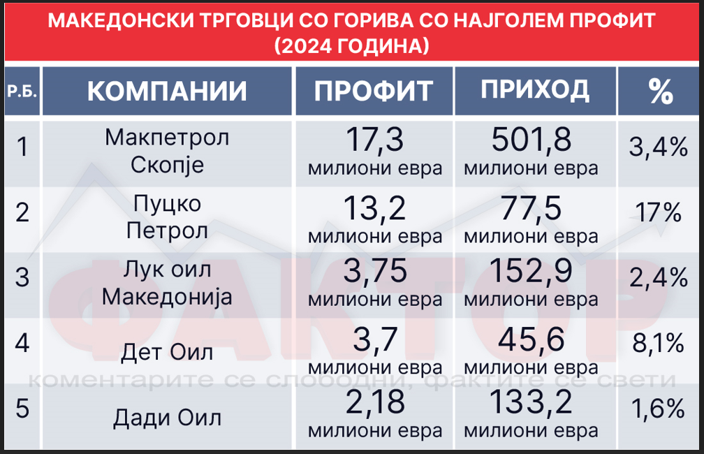 Убедливо најпрофитабилни лани се „Макпетрол“ и „Пуцко Петрол“. При тоа „Макпетрол“ лани остварил добивка што надминува 17 милиони евра и во најзначаен дел акумулираниот профит е од дејноста што ја работи оваа голема македонска компанија.