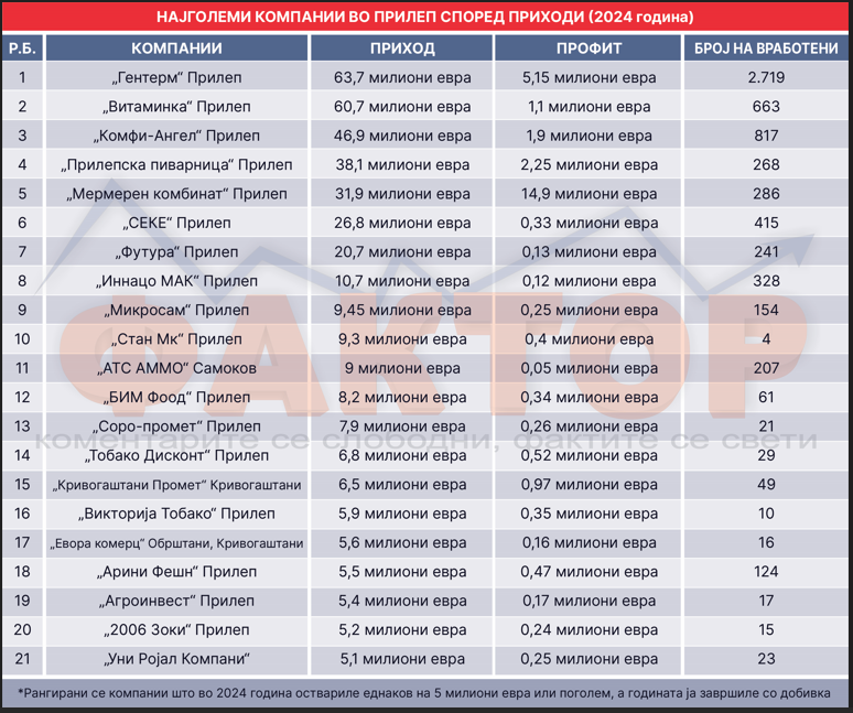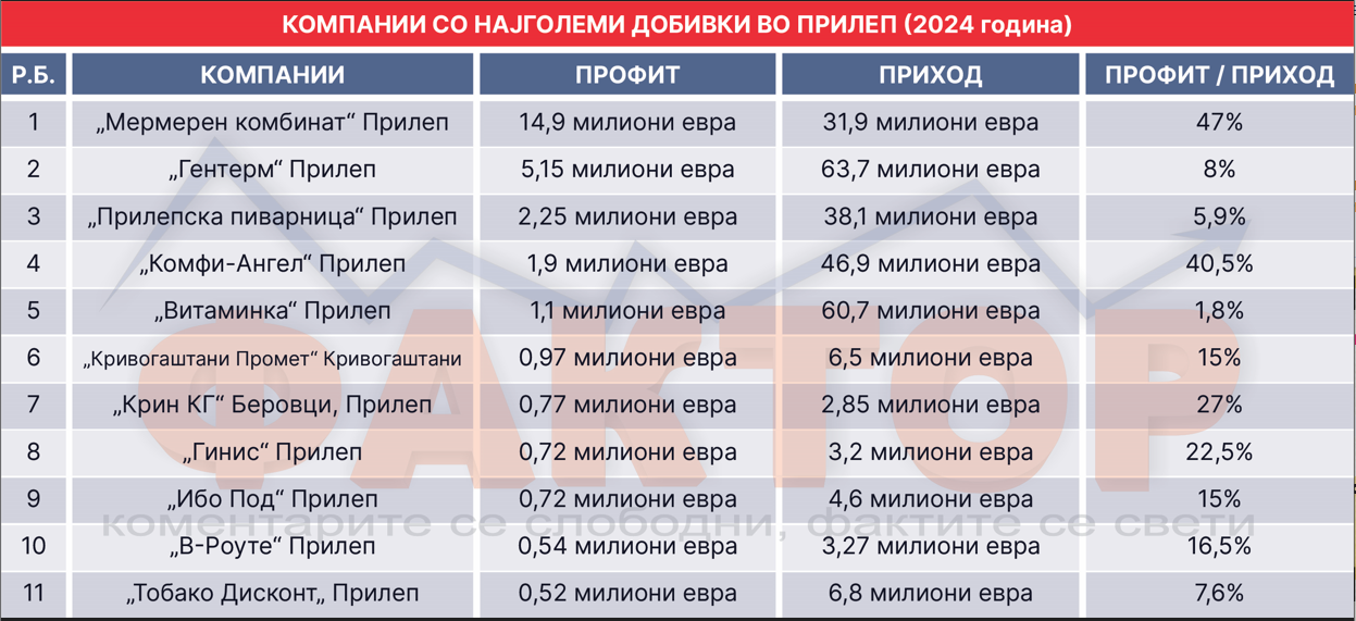 За волја на вистината според остварените приходи најголема прилепска фирма, за нијанса, е странската гринфилд инвестиција „Гентерм“. Од домашно поседуваните компании лани најпрофитабилна била „Прилепска пиварница“. „Витаминка“ и натаму е број еден од домашните компании, а најголем профит традиционално носи прилепскиот мермер под закрила на грчките газди...