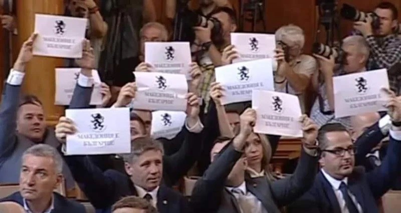 Пратениците од пратеничката група „Преродба“ како и гостите на балконот од пленарната сала во бугарското Народно собрание подигнаа транспаренти со натпис: „Македонија е Бугарија“, а претседавачот на седницата Атанас Атанасов побара да ги тргнат за да не мора да ги земе и да ги избрка надвор од салата.ПЕТКОВ ВЕЛИ МАКЕДОНИЈА ДА НЕ ЈА ИСПУШТА ШАНСАТА