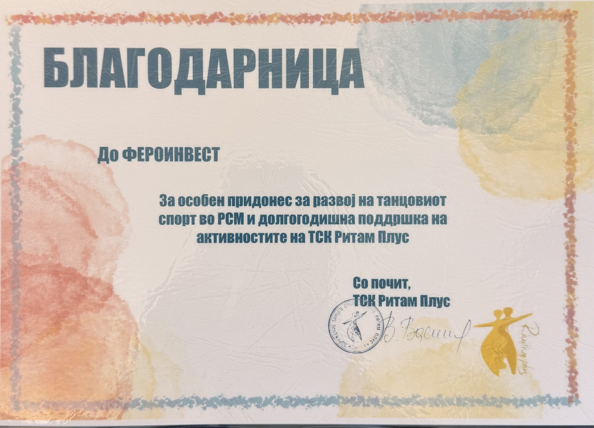 ФЕРОИНВЕСТ беше спонзор на престижниот интернационален натпревар во латиноамерикански и стандардни танци, кој викендов се одржа во Скопје под покровителство на Светската федерација за спортски танц (World DanceSport Federation – WDSF).