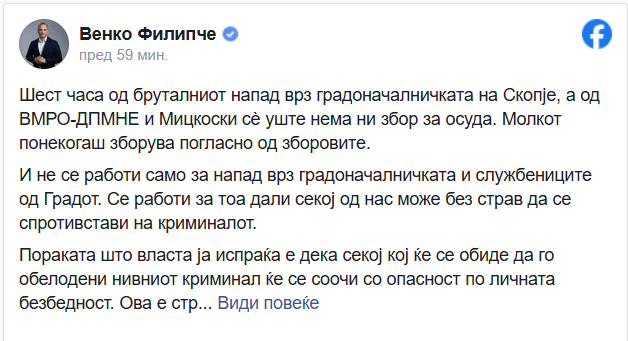„Шест часа од бруталниот напад врз градоначалничката на Скопје, а од ВМРО-ДПМНЕ и Мицкоски сè уште нема ни збор за осуда. Молкот понекогаш зборува погласно од зборовите. И не се работи само за напад врз градоначалничката и службениците од Градот. Се работи за тоа дали секој од нас може без страв да се спротивстави на криминалот. Пораката што власта ја испраќа е дека секој кој ќе се обиде да го обелодени нивниот криминал ќе се соочи со опасност по личната безбедност. Ова е страшно и недозволиво. За една година безбедносната состојба во државата катастрофално се влоши. Безбедноста на граѓаните, правдата, заштитата од институциите практично не постојат. Ова е нешто што треба сериозно сите да нè загрижи“, вели Филипче.