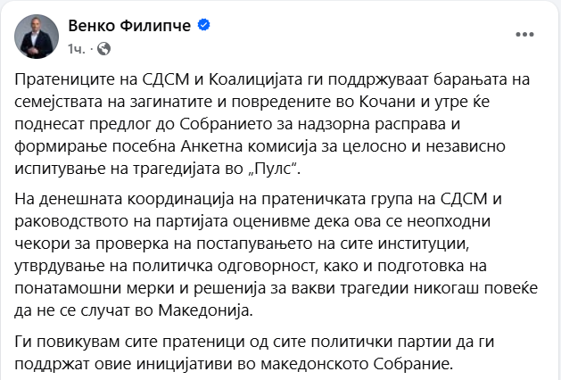 „Пратениците на СДСМ и Коалицијата ги поддржуваат барањата на семејствата на загинатите и повредените во Кочани и утре ќе поднесат предлог до Собранието за надзорна расправа и формирање посебна Анкетна комисија за целосно и независно испитување на трагедијата во „Пулс“, за утврдување на вистината и одговори на сите прашања. На денешната координација на пратеничката група на СДСМ и раководството на партијата оценивме дека ова се неопходни чекори за проверка на постапувањето на сите институции, утврдување на политичка одговорност, како и подготовка на понатамошни мерки и решенија за вакви трагедии никогаш повеќе да не се случат во Македонија. Ги повикувам сите пратеници од сите политички партии да ги поддржат овие иницијативи во македонското Собрание“, стои во објавата на претседателот на СДСМ, Филипче.