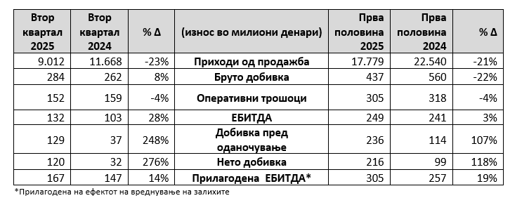 Во првата половина од 2025 година, приходите од продажба изнесуваа 17.779 милиони денари, што претставува намалување од 21% споредено со истиот период минатата година. ЕБИТДА забележа мал раст во споредба со истиот период лани, како резултат на зголемените продажби на домашниот пазар, подобрените извозни маржи, зголемена трговија со електрична енергија со повисоки маржи, како и намаленото негативно влијание од вреднувањето на залихите (56 милиони денари).
