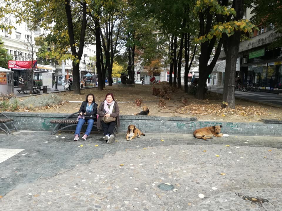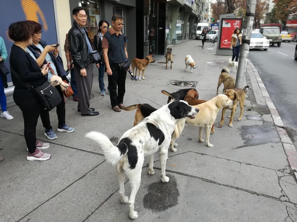Туристи од Азија вчера се фотографираа со глутницата на кучиња-скитници која стана неизбежен декор на плоштадот Македонија и околината во центарот на Скопје.