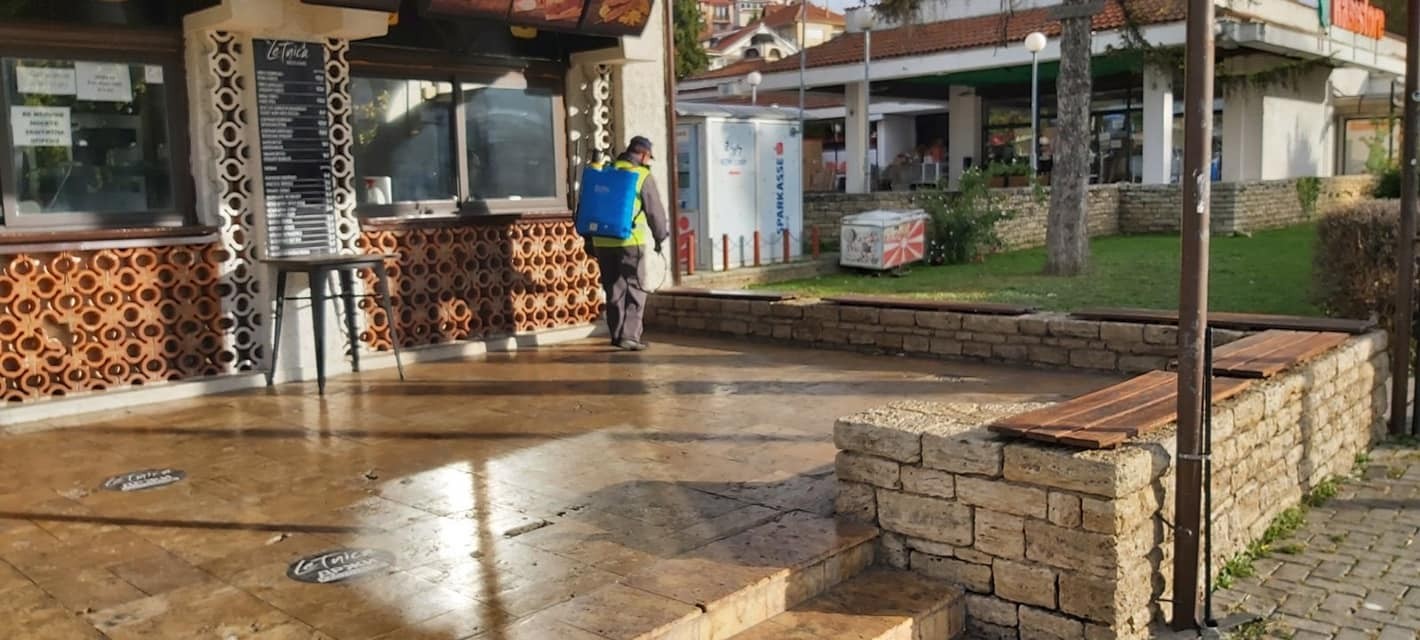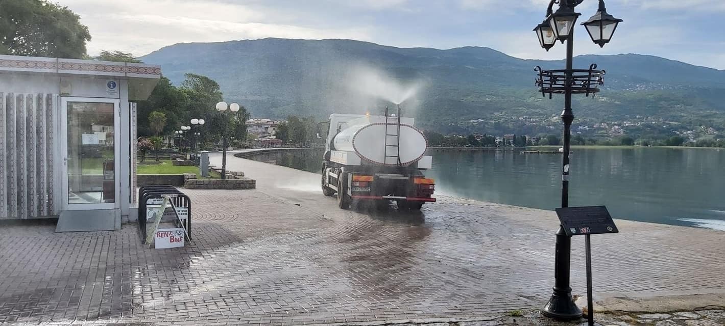 „Со средство за дезинфекција се изврши миење на улиците во централното градско подрачје, градскиот кеј и чаршијата. Дезинфекцијата на јавните површини ќе продолжи интензивно и во текот на наредниот период“ информира Константин Георгиевски, градоначалникот на Охрид.
