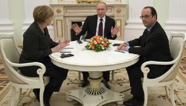 Оланд и Ангела Меркел допатуваа во Москва за да му предложат на Путин нов мировен план за решавање на десетмесечните конфликти во источна Украина, во кои загинаа повеќе од 5300 луѓе.
