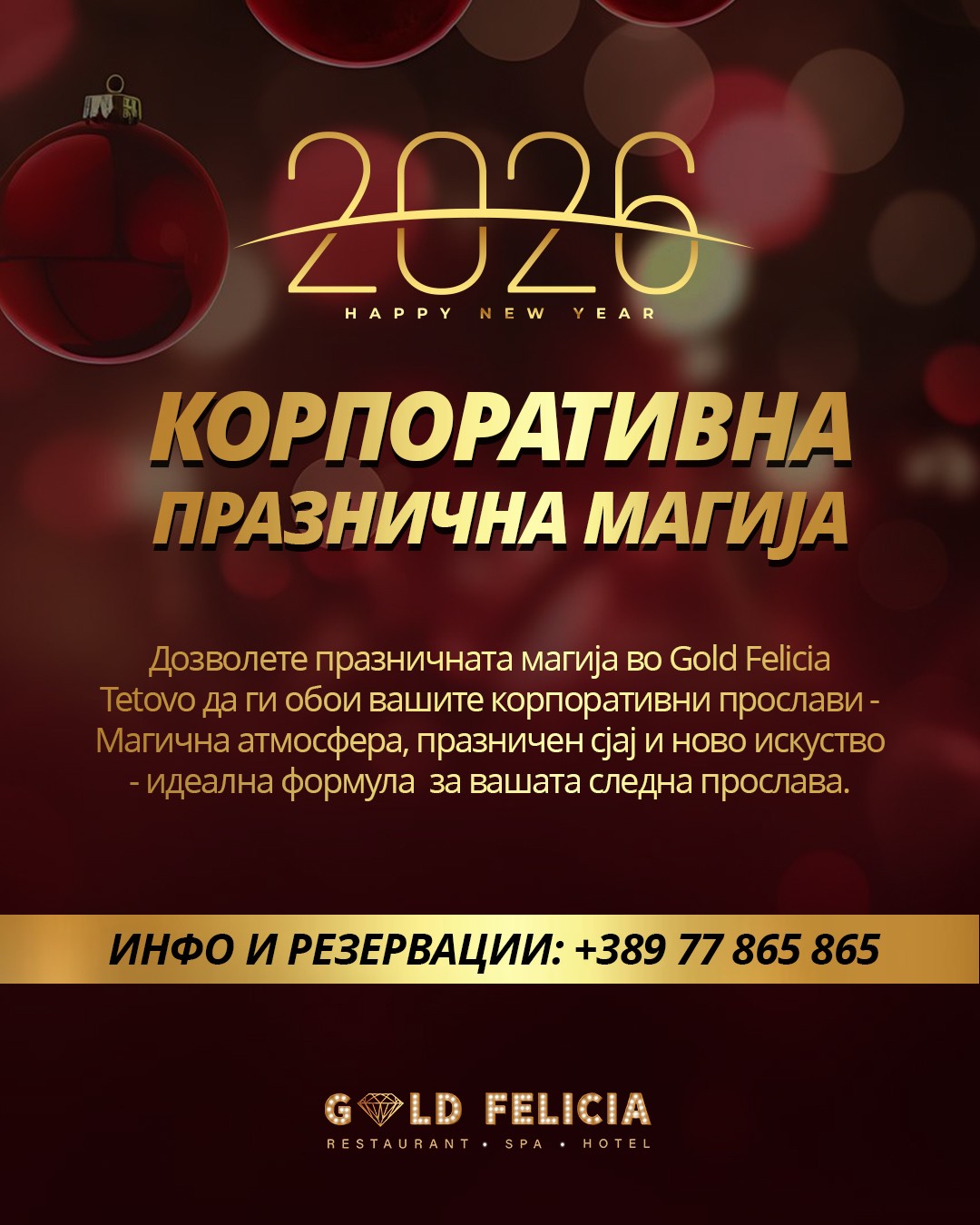 Во пресрет на празничната сезона, Gold Felicia Тетово ги отвора своите врати за организација на корпоративни забави и предновогодишни прослави, нудејќи комплетно искуство создадено според највисоките стандарди на елеганција, услуга и атмосфера.