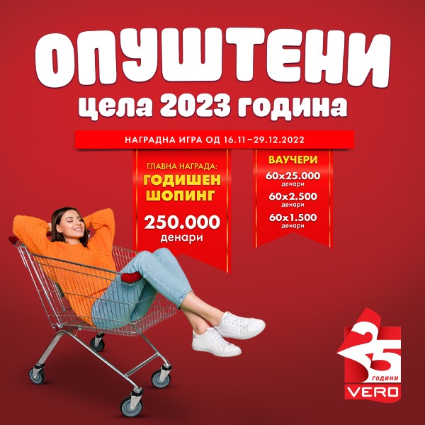 „Опуштено цела 2023 година“ е големата наградна игра за потрошувачите со која Веро ќе ја заокружи јубилејната роденденска година која беше полна изненадувања. Најголемото изненадување доаѓа на крајот – главна премија од 250.000 денари за најсреќниот потрошувач.