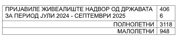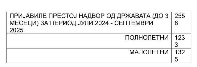 Престој надвор од државата до 3 месеци од јули 2024 година до септември 2025 година пријавиле 2.558 луѓе, од кои полнолетни се 1.233, а малолетни се 1.325.