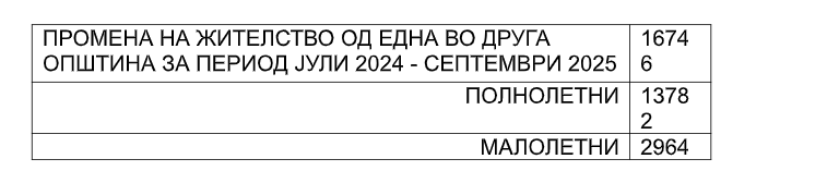 Ако гледаме на ниво на држава, од јули лани до септември годинава, промена на жителство од една во друга општина извршиле 16.746 луѓе, од кои 13.782 се полнолетни, а малолетни се 2.964. Бројките покажуваат дека во летните месеци, јули и август е поголем бројот на луѓе кои направиле промена на жителство.