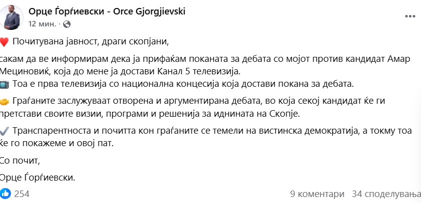 Кандидатот на ВМРО-ДПМНЕ за градоначалник на Скопје, Орце Ѓорѓиевски прифаќа дебата со противкандидатот од Левица, Амар Мециновиќ.