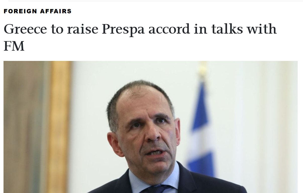 Се очекува Грција да изрази загриженост во врска со неуспехот на Северна Македонија целосно да го спроведе Преспанскиот договор од 2018 година за време на разговорите во Атина во среда меѓу министерот за надворешни работи, Јоргос Герапетритис, и министерот за надворешни работи на Северна Македонија, Тимчо Муцунски, пишува Екатимерини.