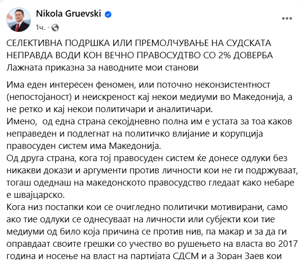 Поранешниот македонски премиер Никола Груевски на Фејсбук пишува дека во Македонија постојат двојни аршини за судството.