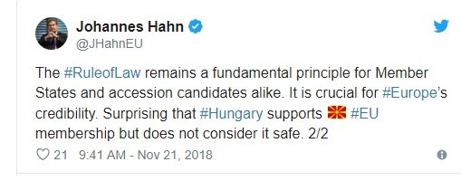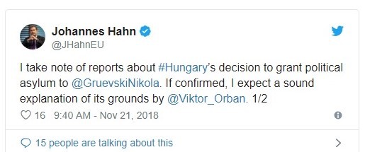 Комесарот за проширување на ЕУ, Јоханес Хан, преку својот профил на Твитер, побара појаснувања од унгарскиот премиер Виктор Орбан за доделениот азил на поранешниот претседател на македонската влада Никола Груевски. Хан бара разјаснување врз основа на кои критериуми Унгарија го одобри азилот на Груевски.