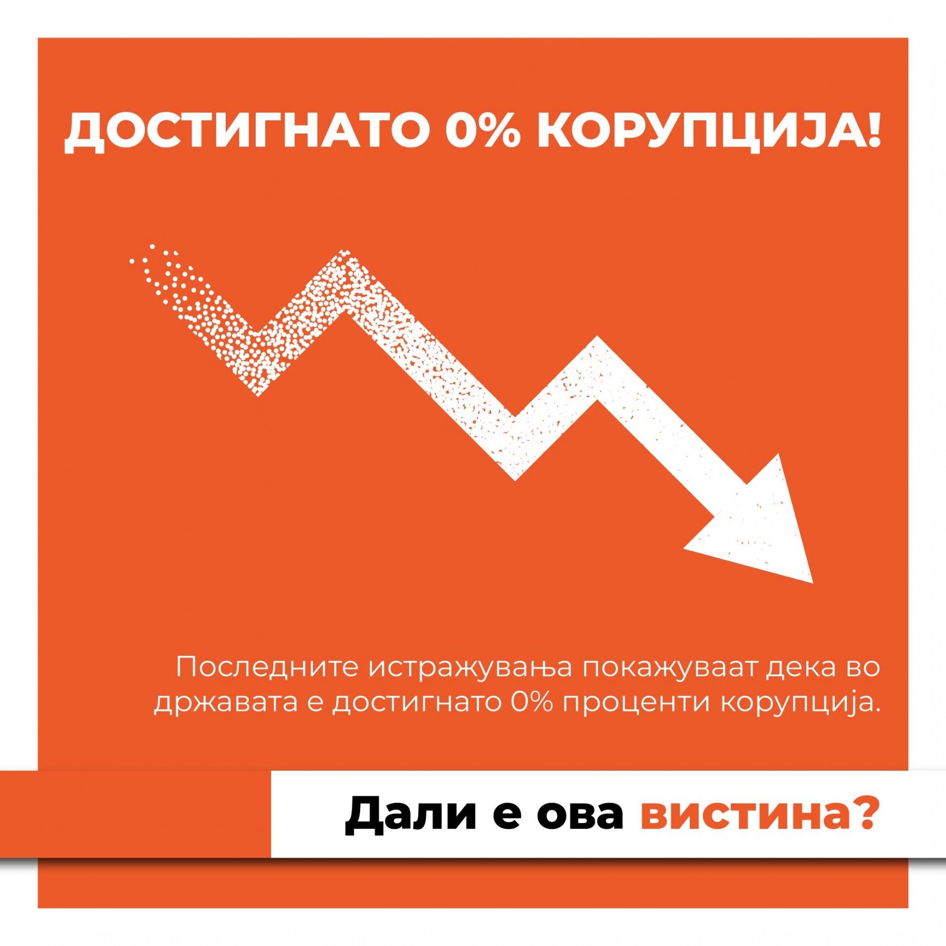 Неверојатна пресвртница покажуваат најновите статистички податоци за корупцијата во земјава – падната е на најниско можно ниво во последниве 10 години. По повеќегодишна долга и упорна борба и соочување со системски проблеми, еден од најголемите општествени непријатели е искоренет од сите пори на општеството. Нула проценти корупција!