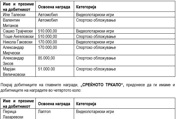 Добитниците на главните награди од наградната игра „ЗАВРТИ И ПОБЕДИ“ се: