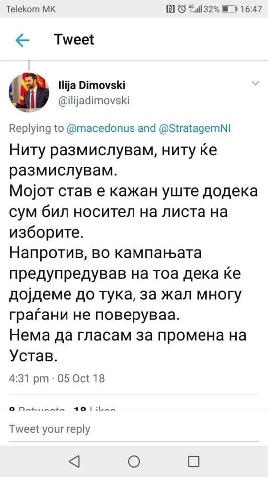 „Ниту размислувам, ниту ќе размислувам. Мојот став е кажан уште додека сум бил носител на листа на изборите. Напротив, во кампањата предупредував на тоа дека ќе дојдеме до тука, за жал многу граѓани не поверуваа. Нема да гласам за промена на Устав“- напиша тој.