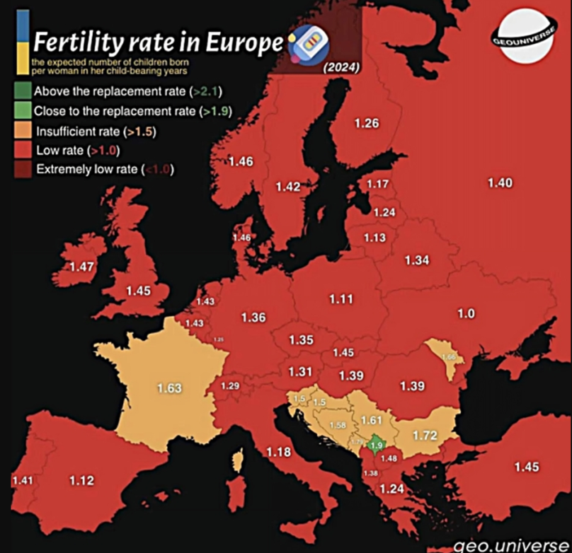 Огромното мнозинство европски држави имаат ниска стапка на фертилитет. Франција, Словенија, Хрватска, БиХ, Србија, Црна Гора, Бугарија и Молдавија стојат подобро од просекот, односно спаѓаат во категоријата на земји со недоволна стапка на фертилитет.