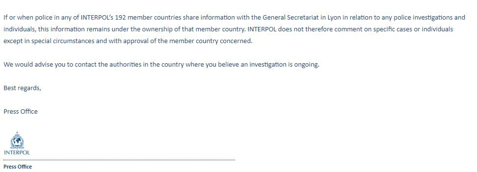 -Не коментираме посебни освен во некои посебни околности-стои во одговорот од Интерпол.