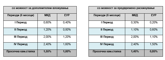 Кај овој производ, доколку се штеди во денари, каматата од 0,30%, колку што е во првите шест месеци, расте на 1,10% за вторите шест месеци, односно 2% и 2,40% за третото и четвртото шестмесечје. Кај штедењето во евра, каматите за секое шестмесечје изнесуваат 0,20%, 0,60%, 1,10%, односно 1,50%.Просечната каматна стапка за целиот период на орочување од 24 месеци кај депозит во денари изнесува 1,45%, а кај депозит во евра 0,85%. Предвремено повлекување е овозможено еднократно и на целиот износ.