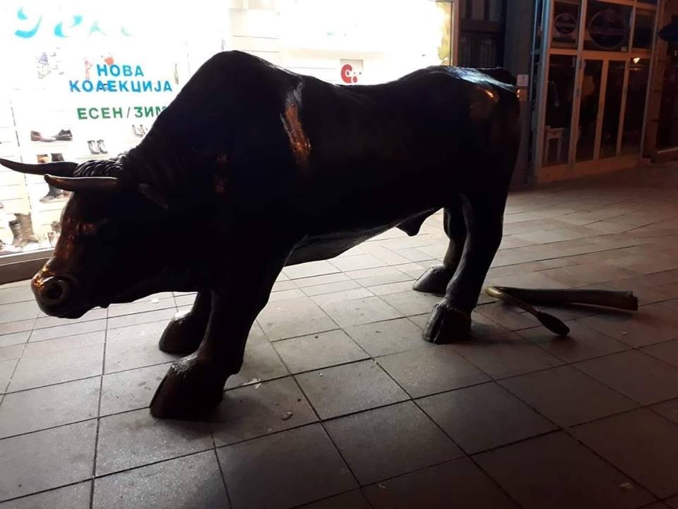 „Бикот“ на улица Македонија во центарот на Скопје остана без опашката, која изутрина била пронајдена скршена.