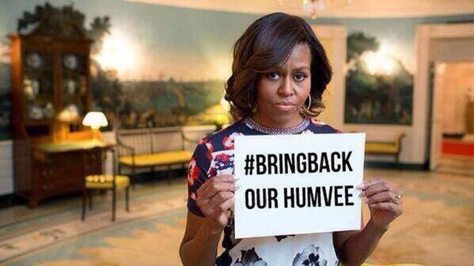 Имено, приврзаниците на ИСИЛ на Твитер поставиле фотографија на сопругата на американскиот претседател Барак Обама. Фотографијата на Мишел Обама е преработена во „фотошоп“ и на неа таа држи порака во рацете со текст: „Вратете ни го нашиот хамер“. Притоа била искористена фотографијата од минатиот месец, со која првата дама на САД на Твитер побара ослободување на 276 ученички во Нигерија, киднапирани од милитантната група Боко Харам. На неа, Мишел Обама држеше порака „Вратете ги нашите девојчиња“.Можеби ќе ве интересира