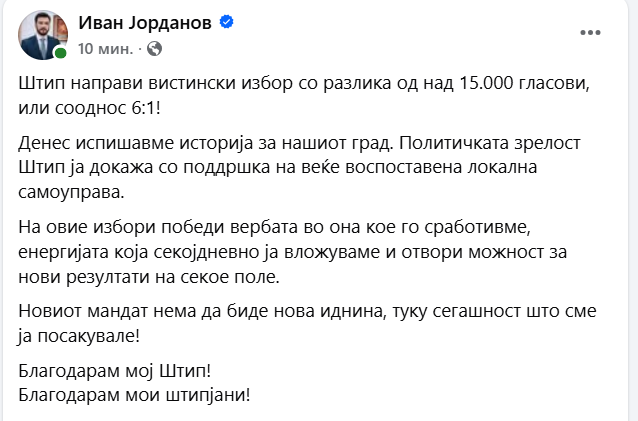 „Штип направи вистински избор со разлика од над 15.000 гласови, или сооднос 6:1! Денес испишавме историја за нашиот град. Политичката зрелост Штип ја докажа со поддршка на веќе воспоставена локална самоуправа. На овие избори победи вербата во она кое го сработивме, енергијата која секојдневно ја вложуваме и отвори можност за нови резултати на секое поле. Новиот мандат нема да биде нова иднина, туку сегашност што сме ја посакувале! Благодарам мој Штип! Благодарам мои штипјани!“, пишува тој.