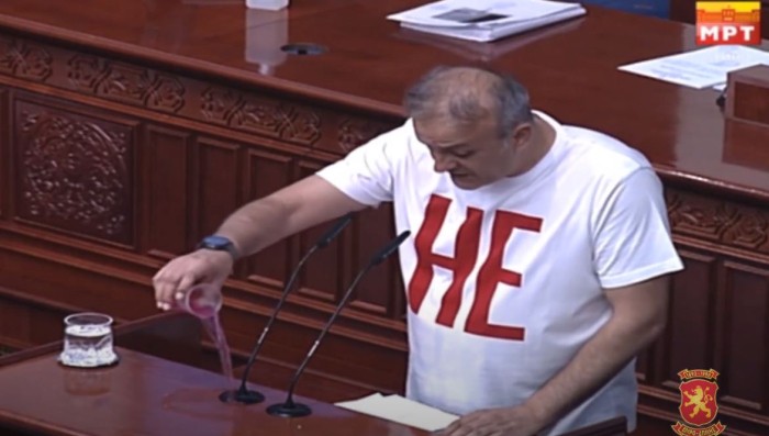 Од ВМРО-ДПМНЕ велат дека пратеникот Тони Јарески истури црвена боја како симбол на крвта на партизаните и младите од Ваташа убиени од Бугарите.