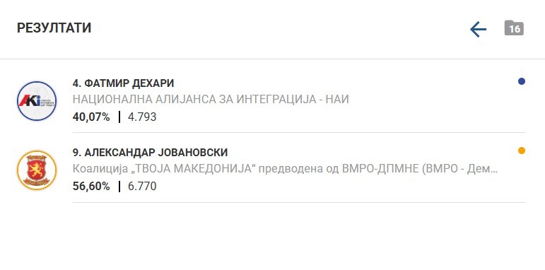 Според досегашните пребројани гласови од речиси 50 проценти од избирачките места во Кичево, Јовановски има 6.770 гласови или 56,60 проценти од гласовите, а Дехари има 4.793 гласови или 40.07 проценти.