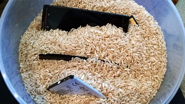 Не сушете го телефонот со фен! Сушењето со фен само ќе ја турне водата таму каде што не стигнала и ќе направи поголема штета. Користете усмукувач, употребете го најтенкиот отвор, а доколку немате усмукувач оставете го телефонот да се исуши сам, околку пола час. После сушењето ставете го телефонот на место кое собира влага - во сад со ориз! Оставете го телефонот или смартфонот така цела ноќ и повремено мешајте го оризот, како зрната од новиот ориз би го заменила местото со оние зрна кои веќе собрале вишок вода.