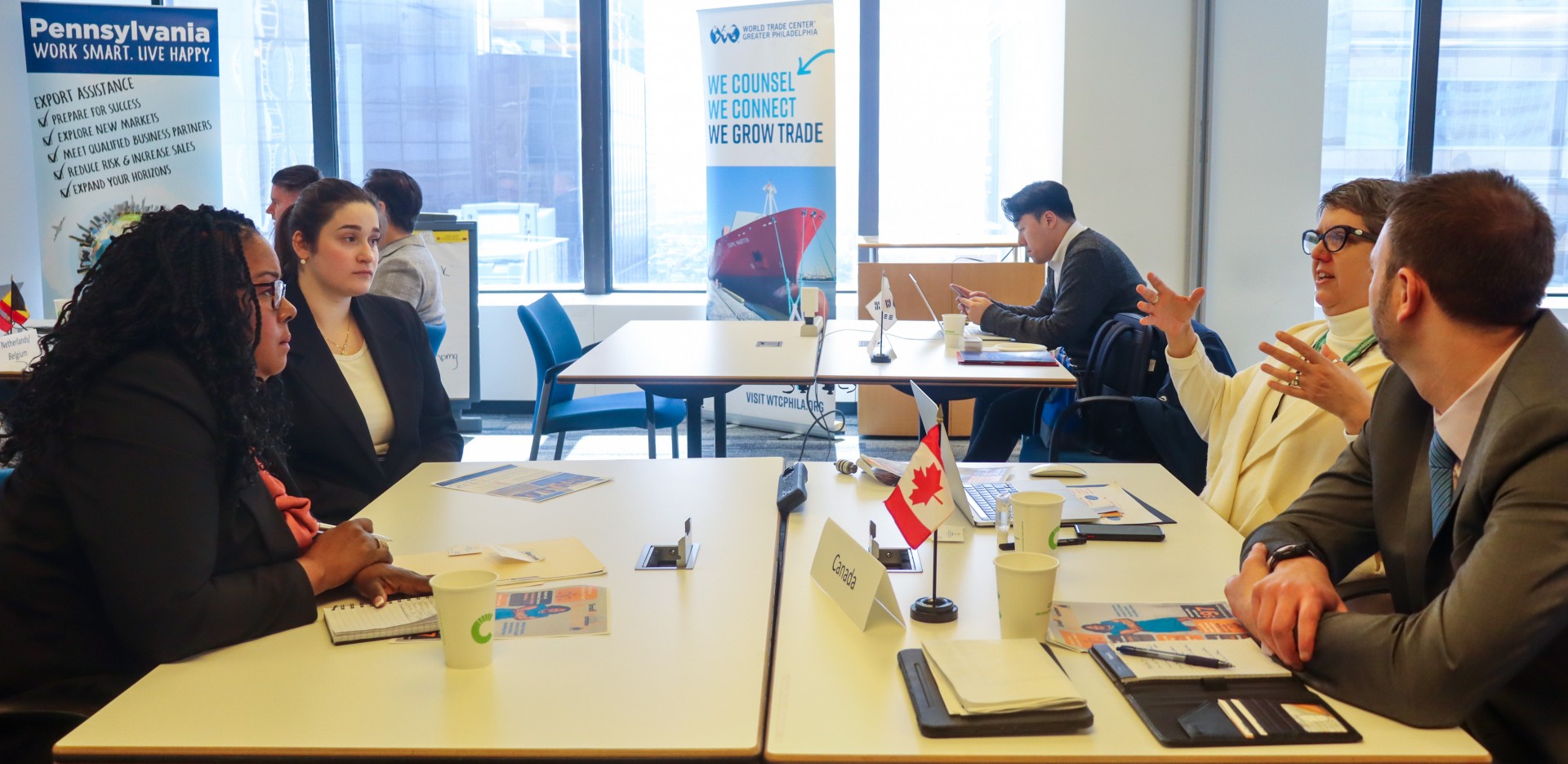 Во Филаделфија, фокусот е насочен кон секторски и регионални кластери. „Нашите бизнис клубови сè повеќе ги пренасочуваме од регионални кон индустриски сектори,“ објаснува Томас Јанг, претседател и извршен директор на WTC Greater Philadelphia. „Ги собираме земјоделците или производителите на напредни технологии за да разменуваат најдобри практики и да слушнат глобални искуства. Нашата улога е да ги обединиме силите и да создадеме услови каде сите добиваат.“