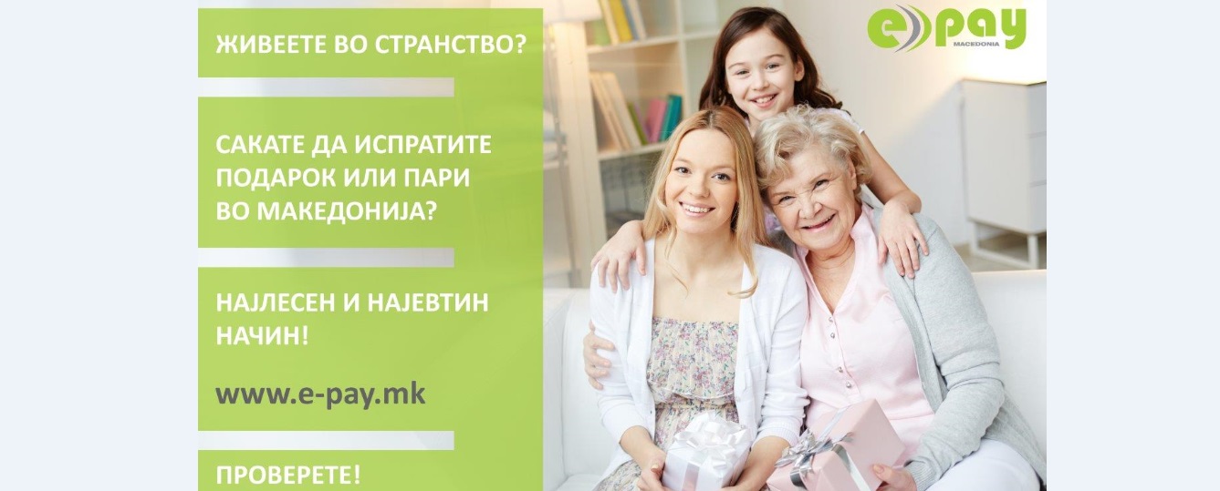 Ваквата услуга која ја нуди е-pay Македонија (www.e-pay.mk) може да ви помогне да испратите парични средства во Македонија, а тоа да биде едноставно, брзо и со крајно мали провизии. Иако средствата кои може да се префрлат не треба да се поголеми од 60.000 денари по трансакција (според законите во Република Македонија), брзината и едноставноста на трансферот е навистина привилегија за корисниците, нешто што не е возможно преку некој друг сличен сервис.