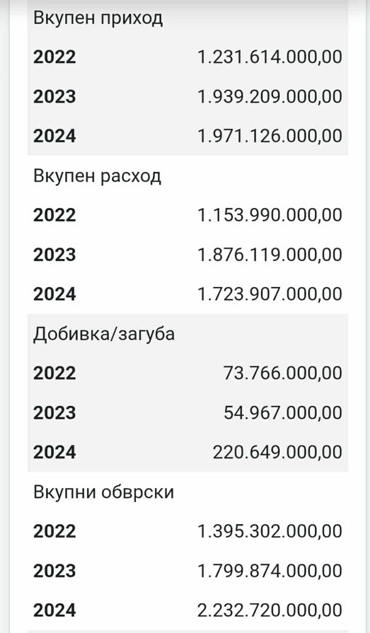 Ако ги погледнеме последните три години ќе видиме дека во 2022 година имале 20 милиони евра приходи, додека расходите достигнале над 25 милиони евра, но успеале да остварат добивка од 1 милион евра.