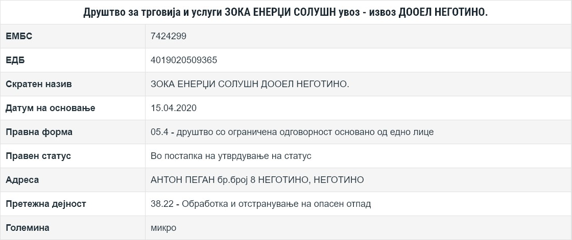 Блокади, долг и никакви активности - вака може да се опише „Зока Енерџи Солушн“ од Неготино, фирмата чиј проект „Фабрика за производство на зелена енергија“ во 2021 година беше претставен како стратешки, а кој предвидуваше од ѓубрето да се добива електрична енергија.