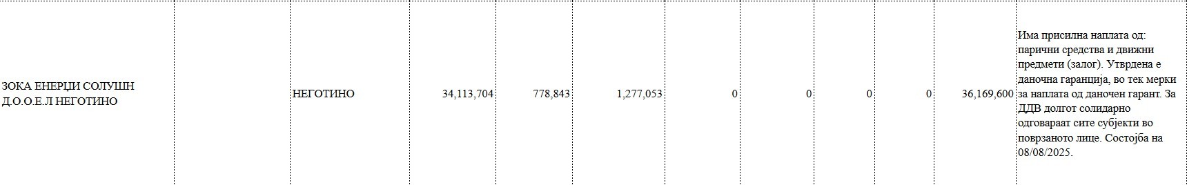 На фирмата е евидентиран и долг за ДДВ, вреден 554 илјади евра, како и долг за данок на добивка од над 12 илјади евра, пари кои преку Управата за јавни приходи треба да се слеат во државниот буџет. Според последниот пресек на УЈП, фирмата должи и над 20 илјади евра за исплата на плати.