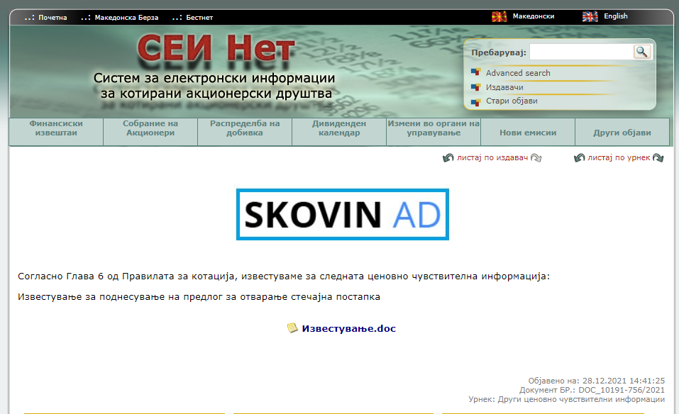 Во официјалното образложение пишува дека одлуката за покренување стечај ја носи Одборот на директори на друштвото, а основа за поднесување барање за отварање стечај има во тоа што банкарската сметка на друштвото е блокирана повеќе од 45 дена.