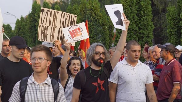 Претседателот на Левица, Димитар Апасиев излезе на протестот против францускиот предлог пред Собранието.