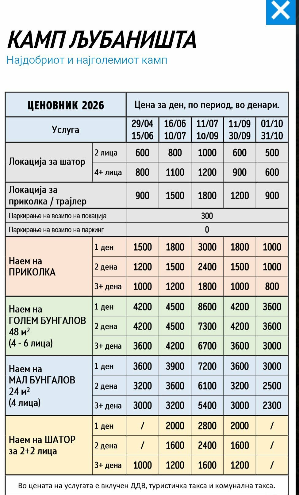 Кампот Љубаништа во Охрид. деновиве ги објави новите цени за сезоната 2026.