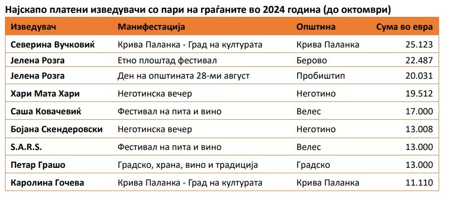Најскапо платена, годинава, е Северина, за која Крива Паланка издвоила 25 илјади евра. Сепак, според истражувањето, годинава најмногу пари добила Јелена Розга – 42 илјади евра, за два настапа, во Берово и во Штип.