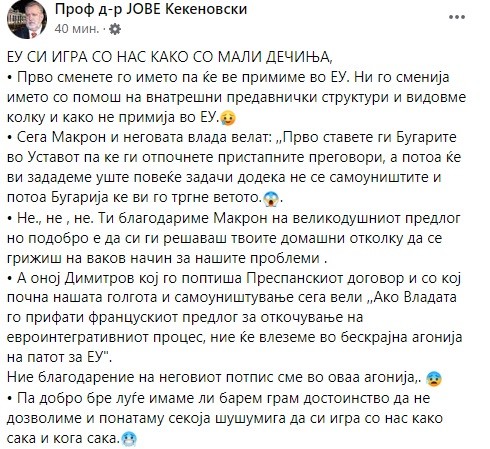 „Прво сменете го името па ќе ве примиме во ЕУ. Ни го сменија името со помош на внатрешни предавнички структури и видовме колку и како не примија во ЕУ. Сега Макрон и неговата влада велат: ,,Прво ставете ги Бугарите во Уставот па ке ги отпочнете пристапните преговори, а потоа ќе ви зададеме уште повеќе задачи додека не се самоуништите и потоа Бугарија ке ви го тргне ветото. Не., не , не. Ти благодариме Макрон на великодушниот предлог, но подобро е да си ги решаваш твоите домашни отколку да се грижиш на ваков начин за нашите проблеми“, пишува тој.