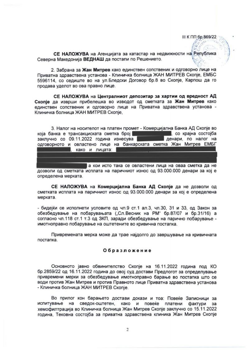 За овие индиции за поврзаност да бидат уште поочигледни, се случи токму тоа што го бараше ДоказМ во текстот на порталот со датум 15.11.2022, односно да се блокира сметката на Клиника Жан Митрев и да се забрани продажба на удели!