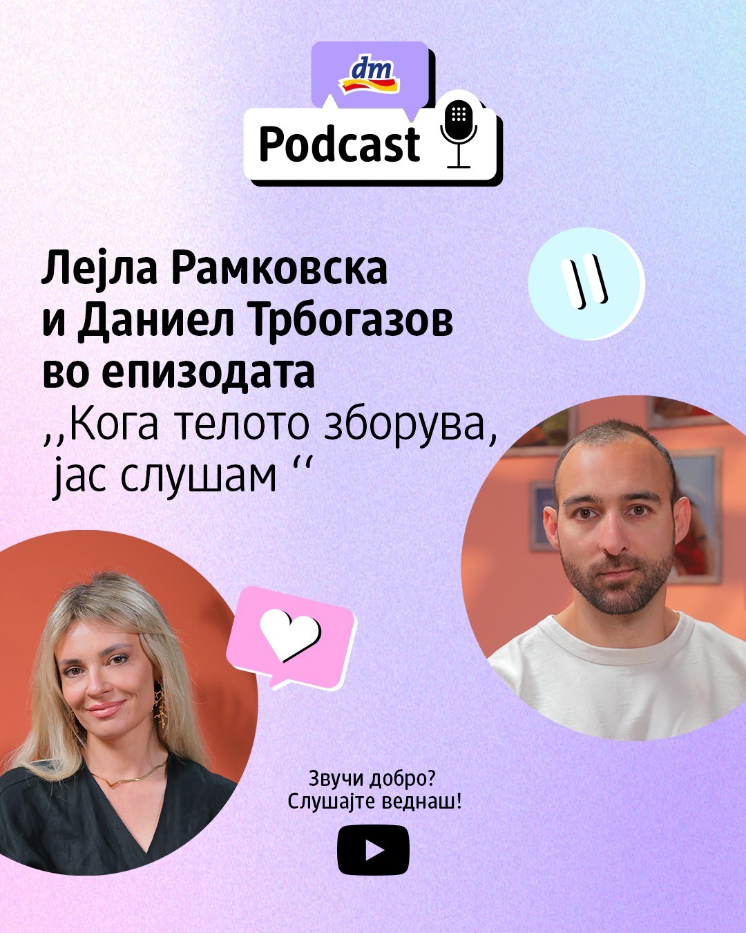 Во првата епизода, гости се Лејла Рамковска, јога инструкторка и сопственичка на јога студиото Club8, инфлуенсерка и мајка на две деца и Даниел Трбогазов, дипломиран професор по физичко образование и главен уредник и основач на порталот „Мој Тренер“.